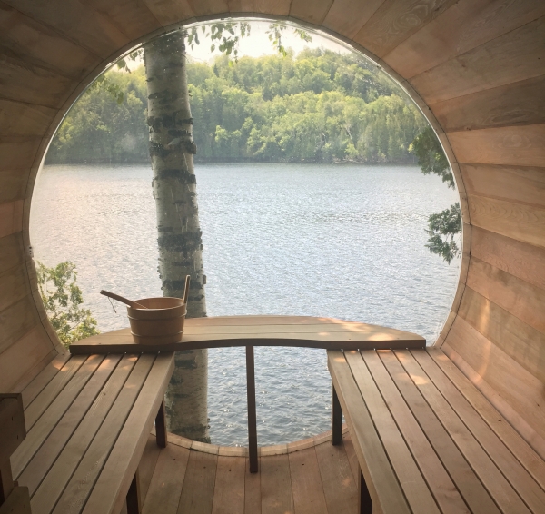 We are very exited to introduce all NEW Premium Panoramic View Clear Western Red Cedar Barrel Sauna. This sauna comes with an acrylic bubble back wall that allows you to see the beautiful view of you lake or landscape from inside the sauna. This unique sauna feels spacious and the views just add to the relaxing feeling when in the sauna.