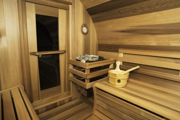 This unit comes with the choice of a 6 kW electric sauna heater or Harvia Wood Burning sauna heater. Clear cedar benches on the inside can be used for a lying down or sitting up position.