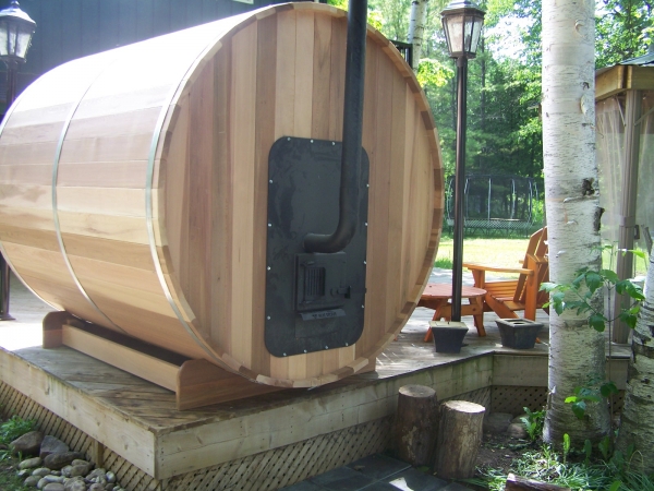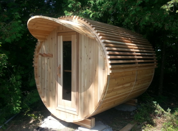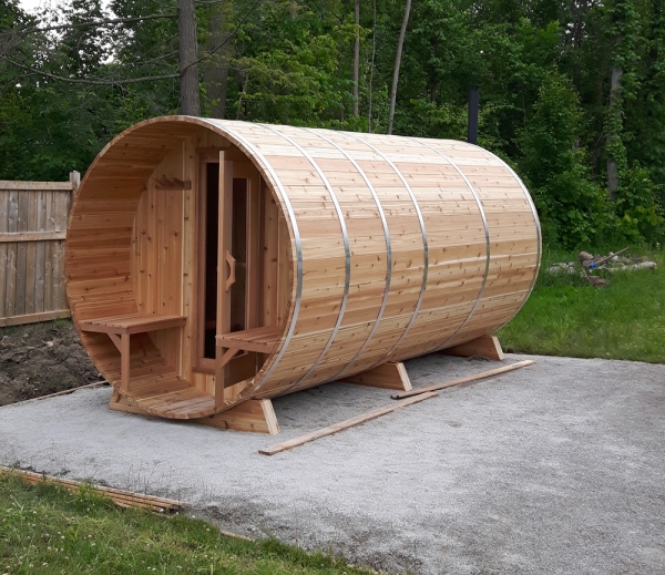 This 7ft Diameter x 7ft Long Knotty Red Cedar Barrel Sauna seats 6 people comfortably.  The 1 1/2″ cedar boards and stainless steel hardware will ensure this barrel sauna lasts a long time.