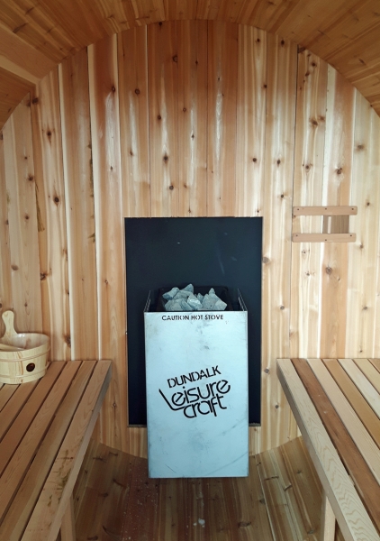 This unit comes with the choice of a  electric sauna heater, Harvia wood burning heater or traditional wood burning stove. Clear cedar benches on the inside can be used for a lying down or sitting up position.