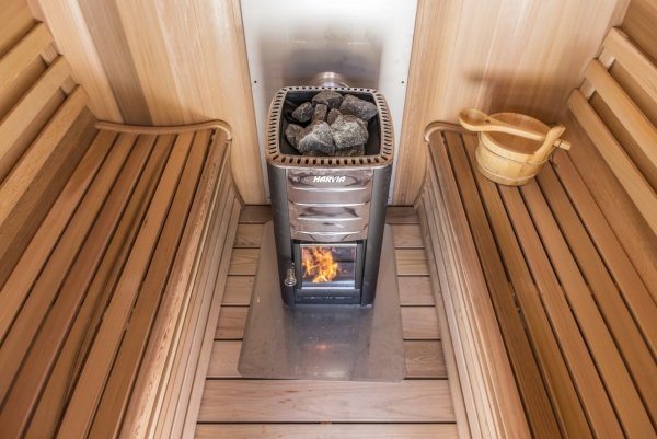 Available with Harvia M3 Wood Burning Sauna Heater, electric sauna heater or our own wood burning sauna heater.